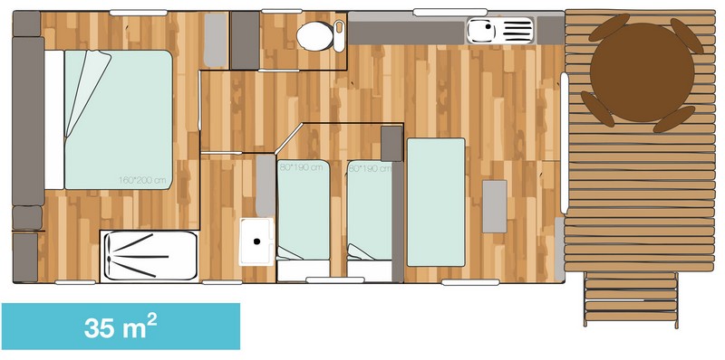6 Personen, Fläche ca. 35m² plus überdachter Terrasse von ca. 6m²